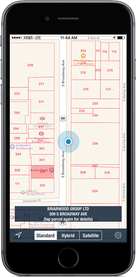 - Launch the app with a simple tap of your finger. The display instantly shows where you are and highlights the property you are at and “Who Owns It”.
